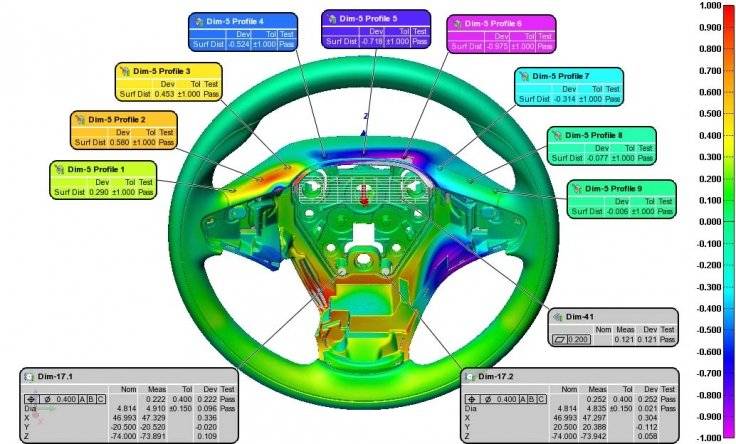 Vous connaitrez alors les écarts de forme et de dimensions de la pièce grâce à des couleurs et des étiquettes posées à des endroits précis sur la pièce. - Le contrôle des mesures dimensionnelles : c’est le contrôle de métrologie industrielle traditionnel par rapport au plan 2D. C’est-à-dire que nous pouvons reprendre les côtes du plan 2D sur la pièce physique et les comparer à la valeur nominale du plan.